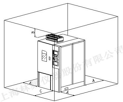 高低溫試驗箱的左、右、前、后側及頂部必須留有一定的空間以便通風和維護, 如圖: